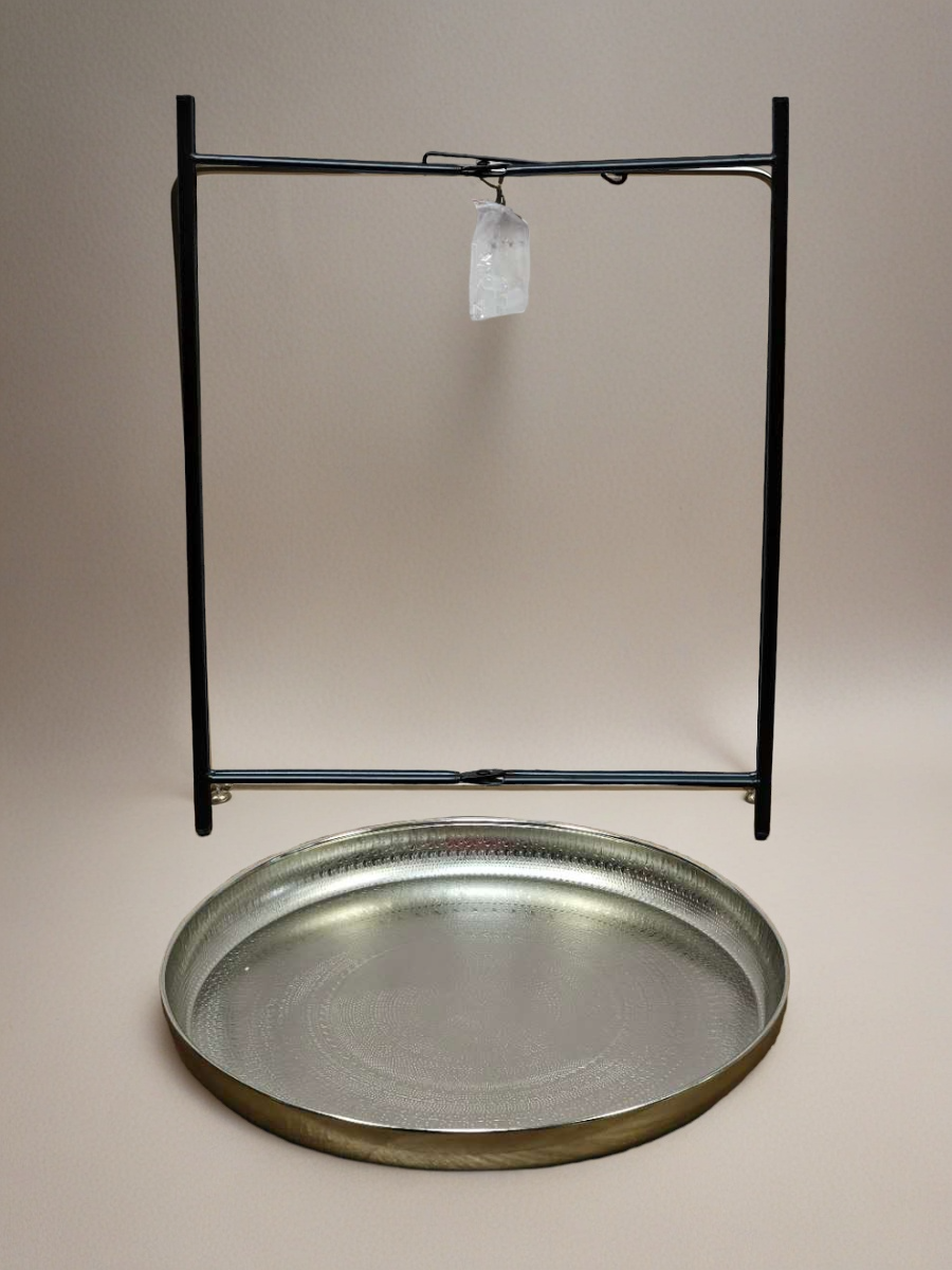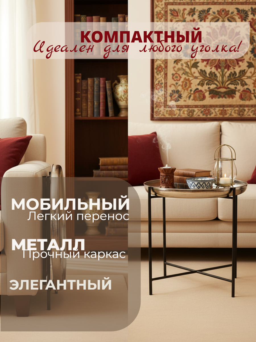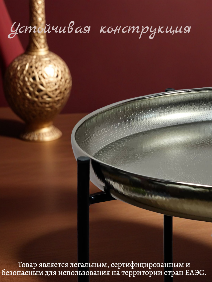 Раскладной столик из металла с серебристой столешницей диаметром 33 см и бортиком 3 см, украшенный орнаментом в восточном стиле. Ножки из профильной трубки диаметр 1 см с крестовиной, фиксируются крючком.