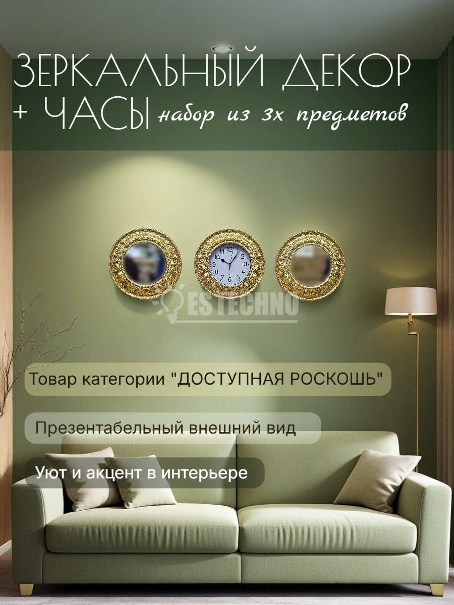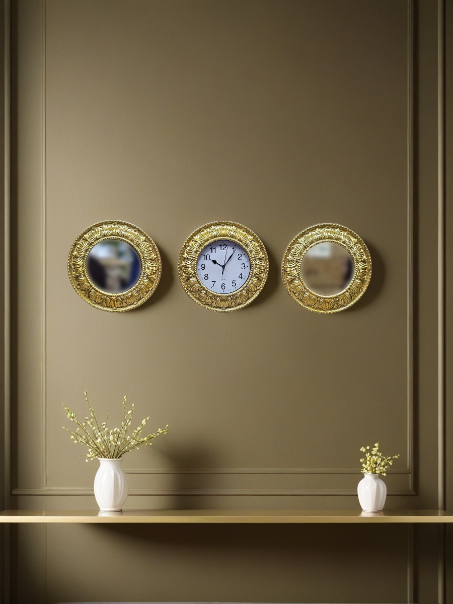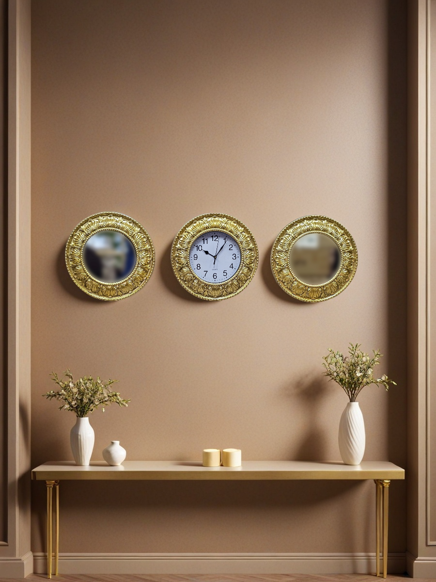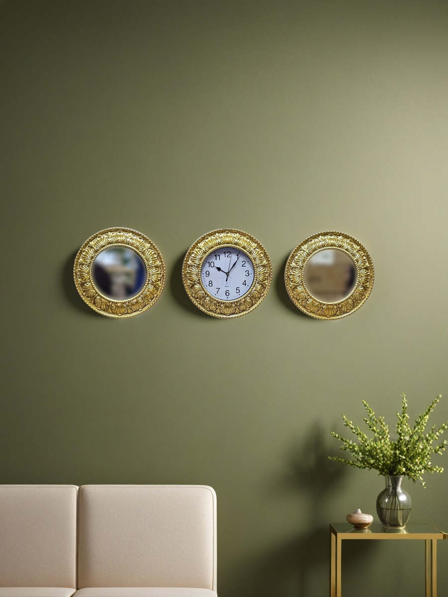 Комплект настенного декора, состоящий из трех круглых элементов: двух зеркал и одних часов, все в золотистых рамах с классическим орнаментом. Рамы выполнены из пластмассы, окрашены золотистой краской, диаметр каждого элемента 30 см. Изделия относятся к недорогому сегменту, но выглядят презентабельно и аккуратно.