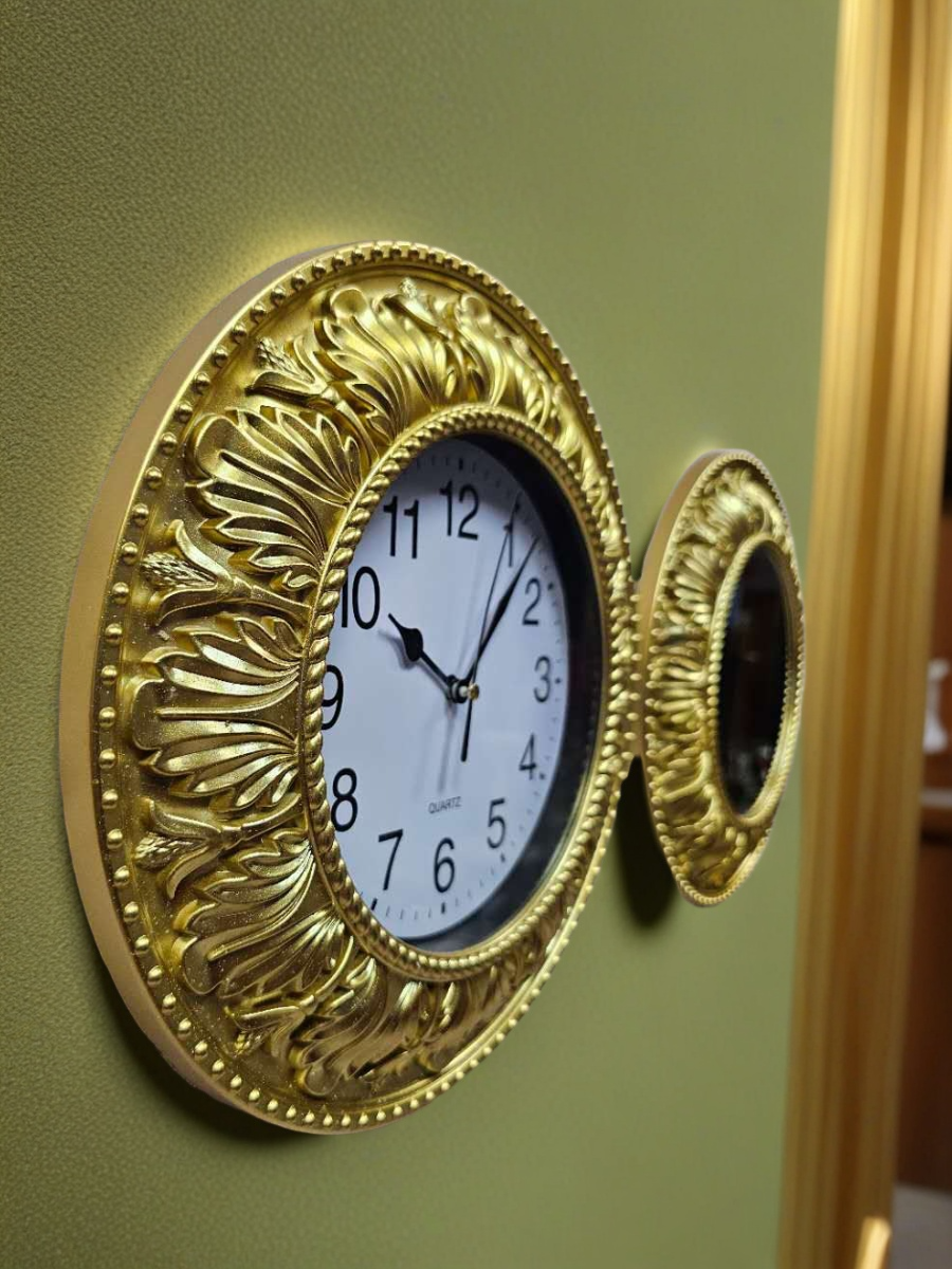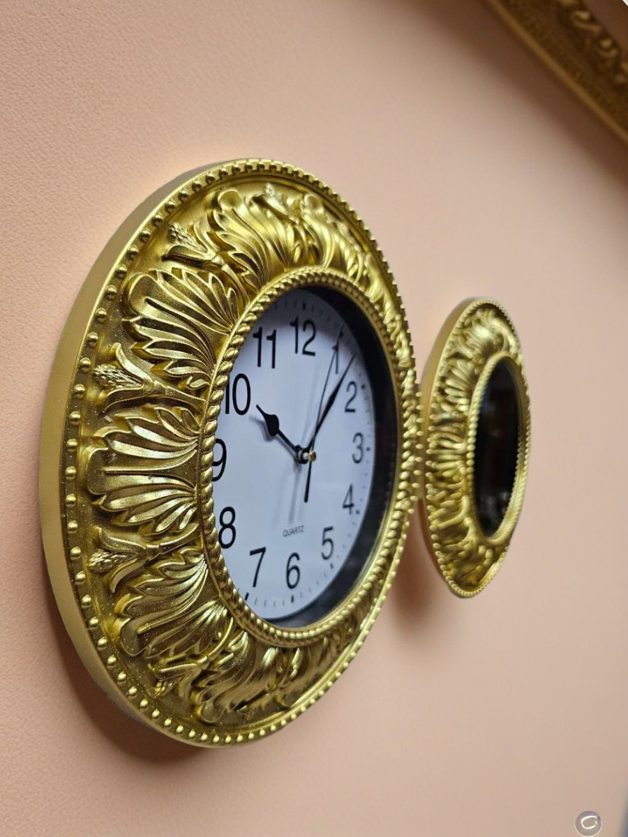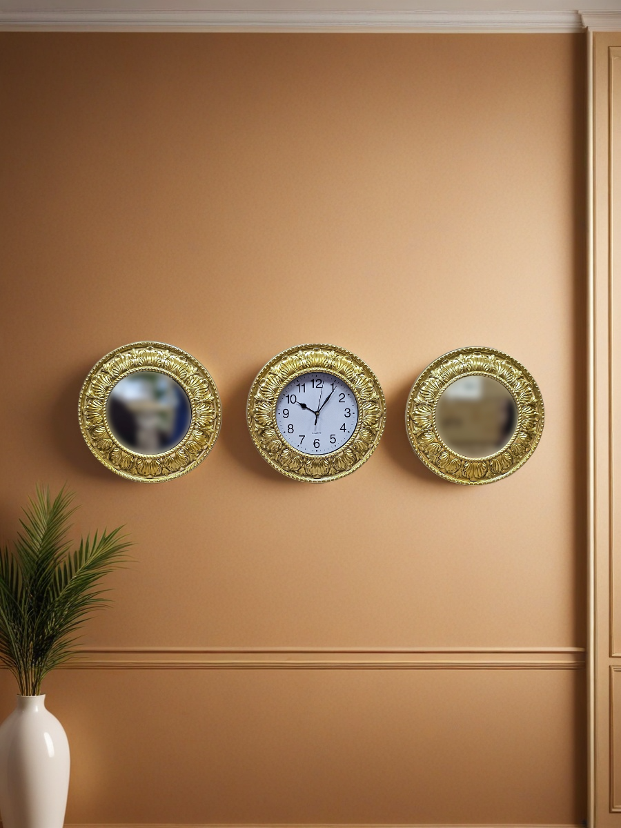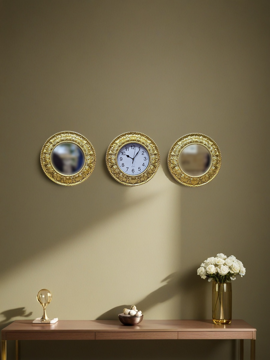 Комплект настенного декора, состоящий из трех круглых элементов: двух зеркал и одних часов, все в золотистых рамах с классическим орнаментом. Рамы выполнены из пластмассы, окрашены золотистой краской, диаметр каждого элемента 30 см. Изделия относятся к недорогому сегменту, но выглядят презентабельно и аккуратно.