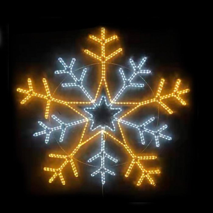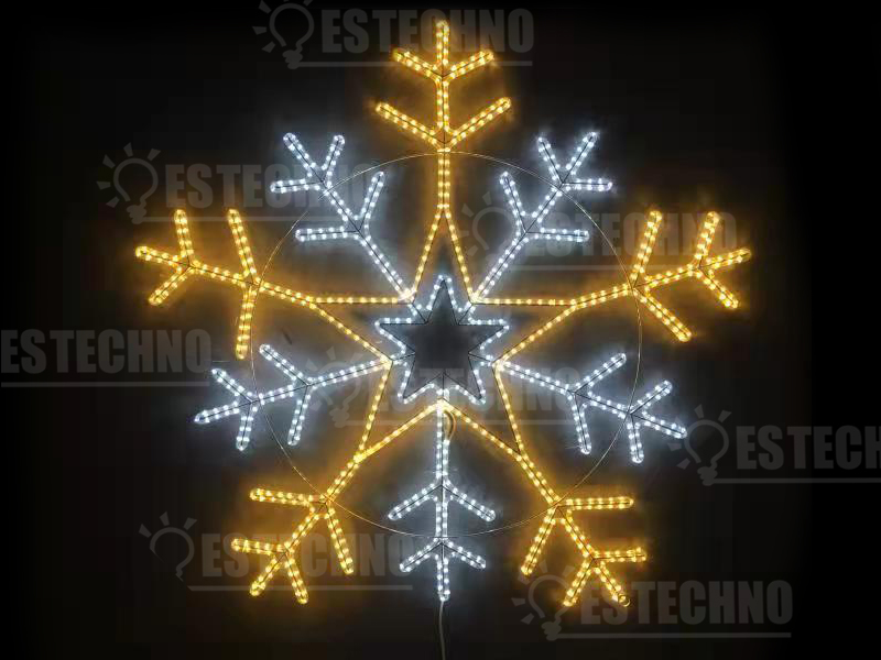 Новогодние украшения " Гигантские снежинки " для уличных ёлок, деревьев, фасадов зданий, витражей и входных зон. Плоские светодиодные декоративные элементы (2 D) из сварного алюминиевого каркаса и подсветки дюралайтом, оснащены креплениями для подвесного монтажа, вы без особого труда сможете закрепить их на поверхности . Диаметр светодиодного шнура 13 мм.